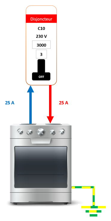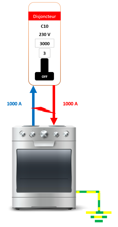 Les fils de phase et de neutre sont connectés ensemble et cela entraine une consommation très élevée d’ampères. Le disjoncteur détecte le problème et doit couper le plus rapidement possible.