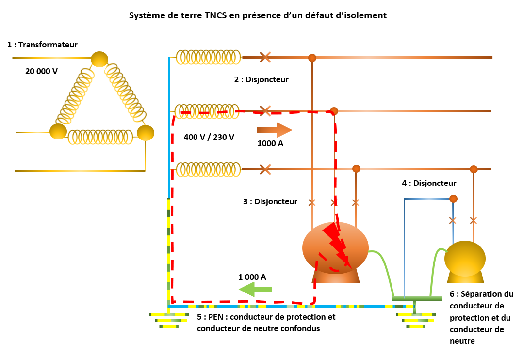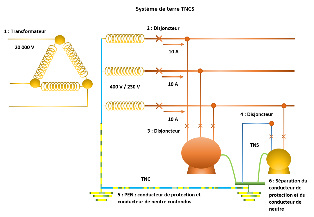 1 : Transformateur ; 2 et 3 et 4 : Disjoncteur ; 5 : PEN : Conducteur de protection et conducteur de neutre confondus ; 6 : Séparation du conducteur de protection et du conducteur de neutre
