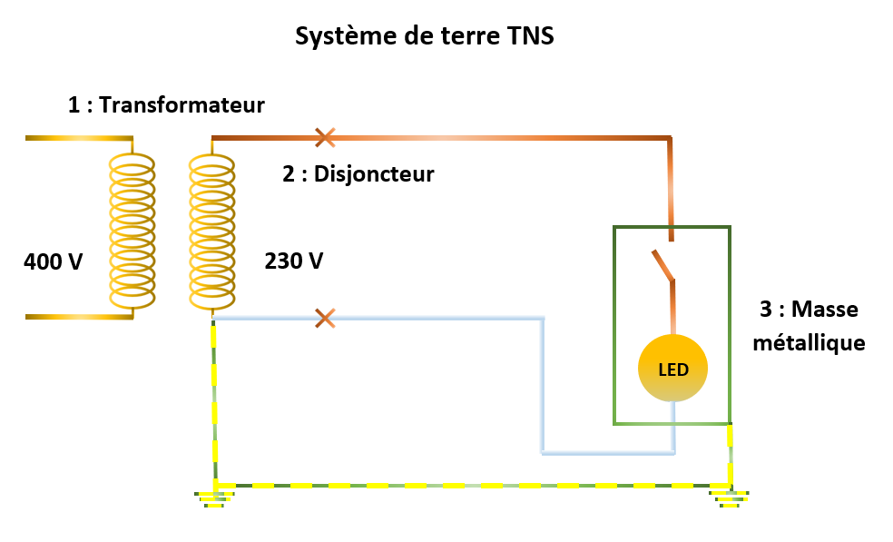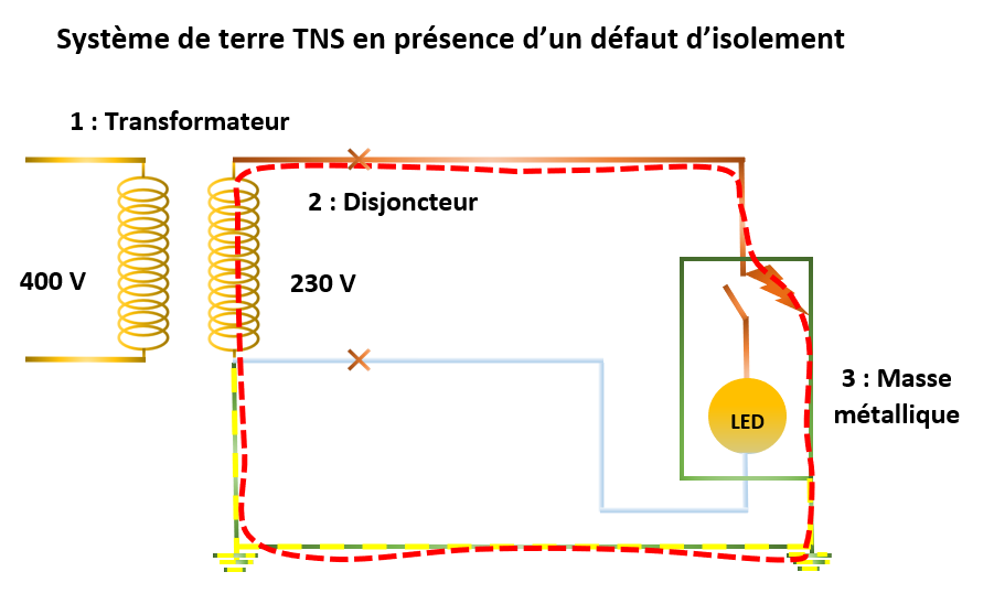 Sur le schéma TNS, la résistance du circuit de terre est faible et la tension sur les masses métalliques en cas de défaut d’isolement sera faible.