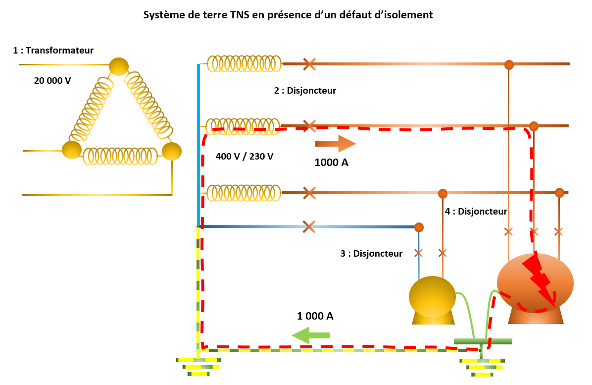 Système de terre TNS triphasé en présence d'un défaut d'isolement