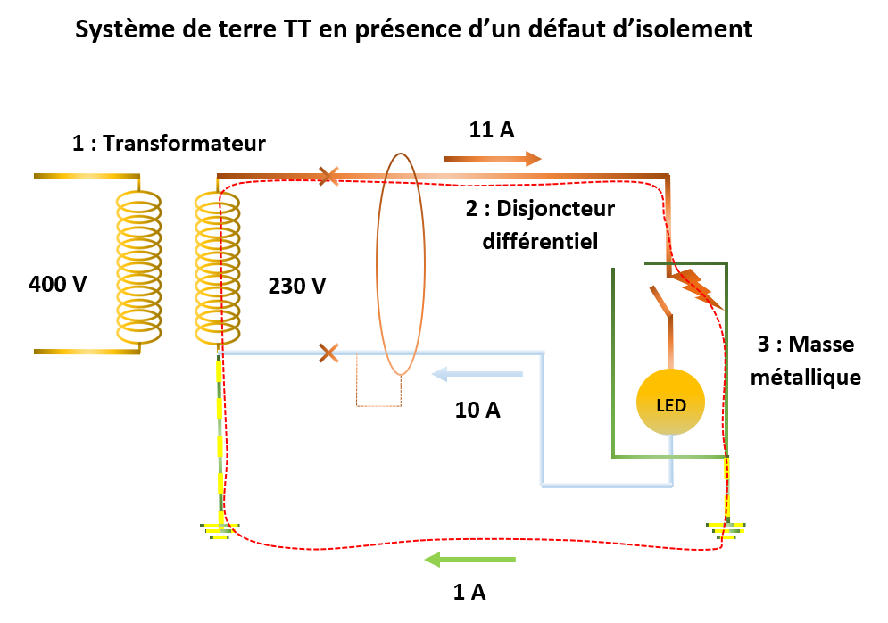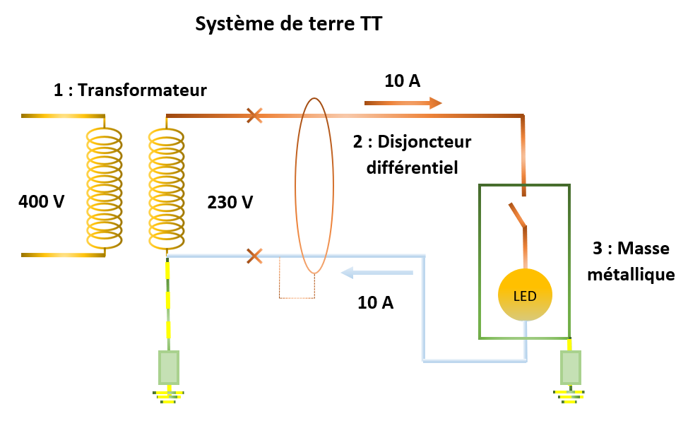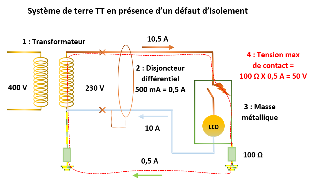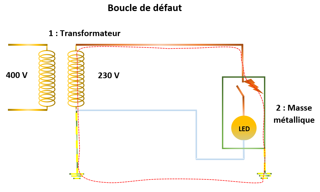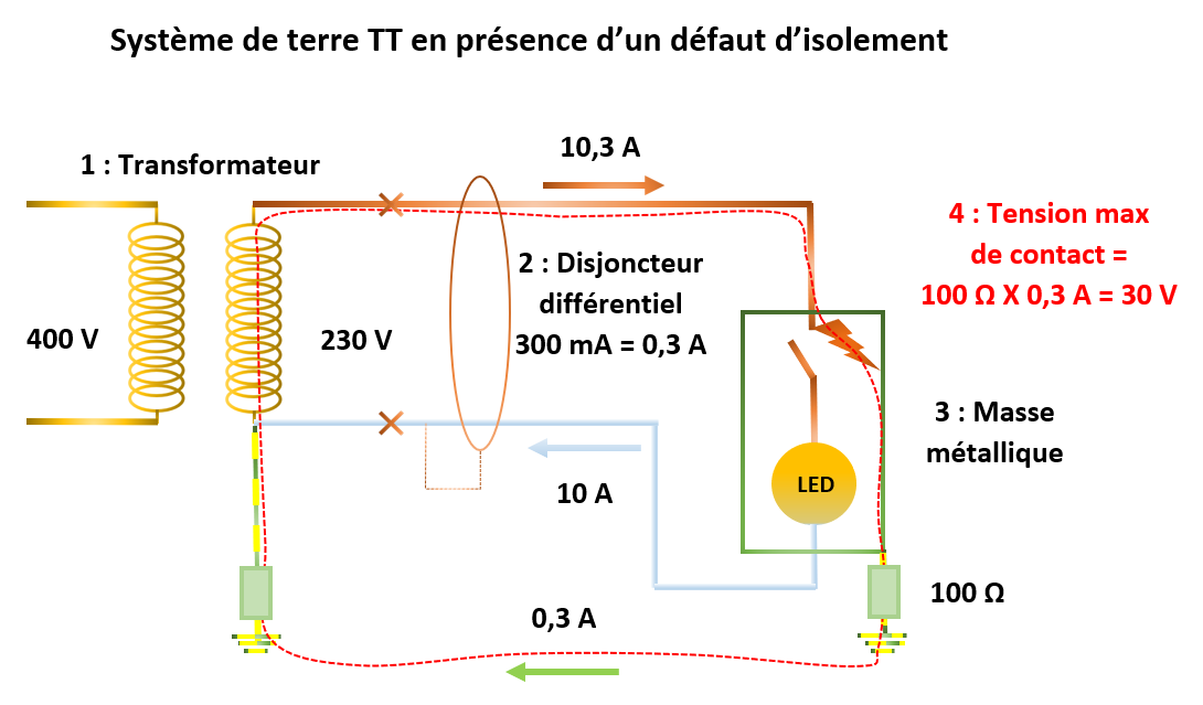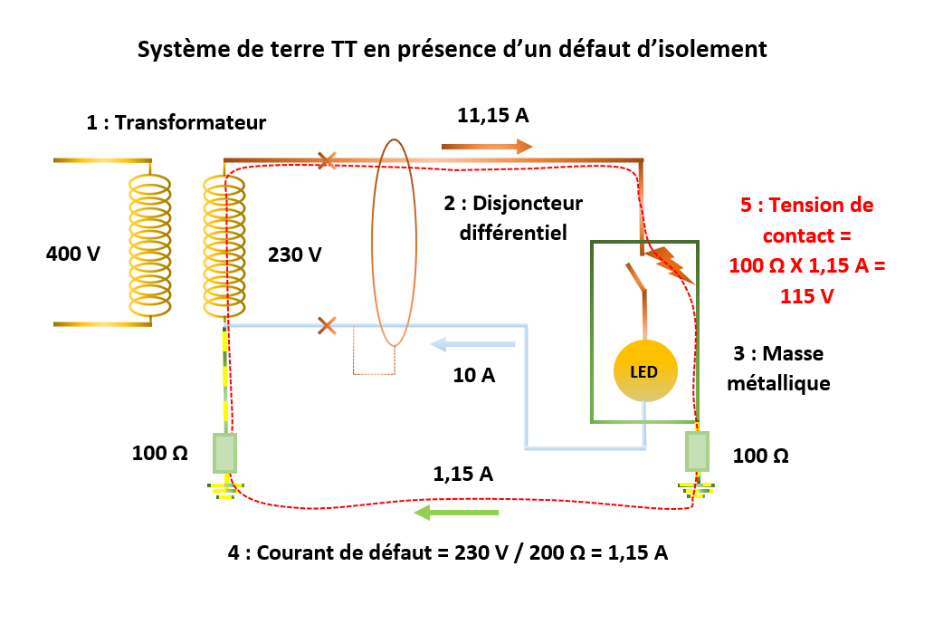 1 : Transformateur ; 2 : Disjoncteur différentiel ; 3 : Masse métallique ; 4 : Courant de défaut ; 5 : Tension de contact ;
