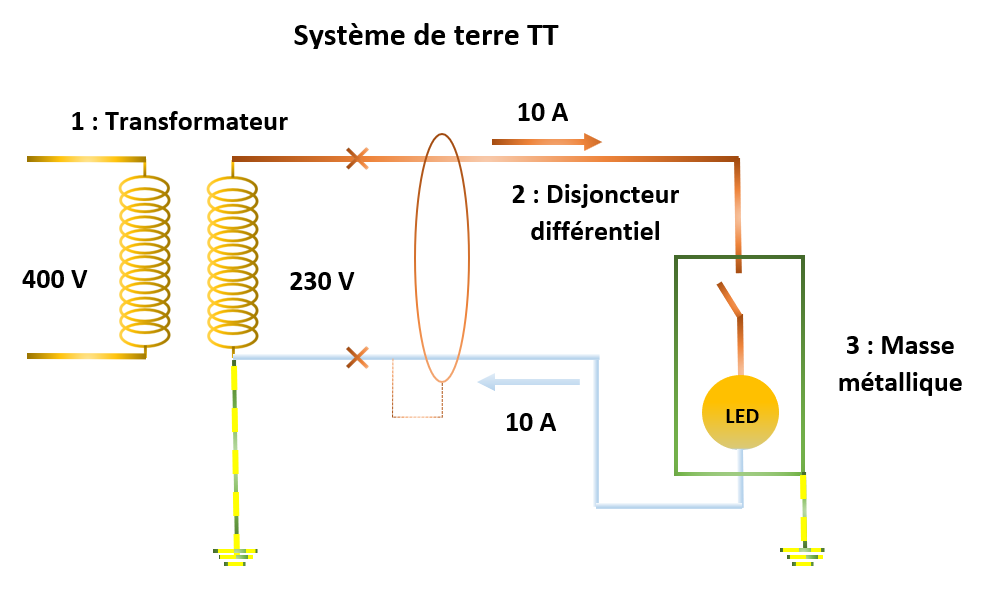 1 : Transformateur ; 2 : Disjoncteur différentiel ; 3 : Masse métallique