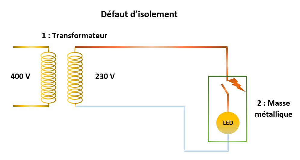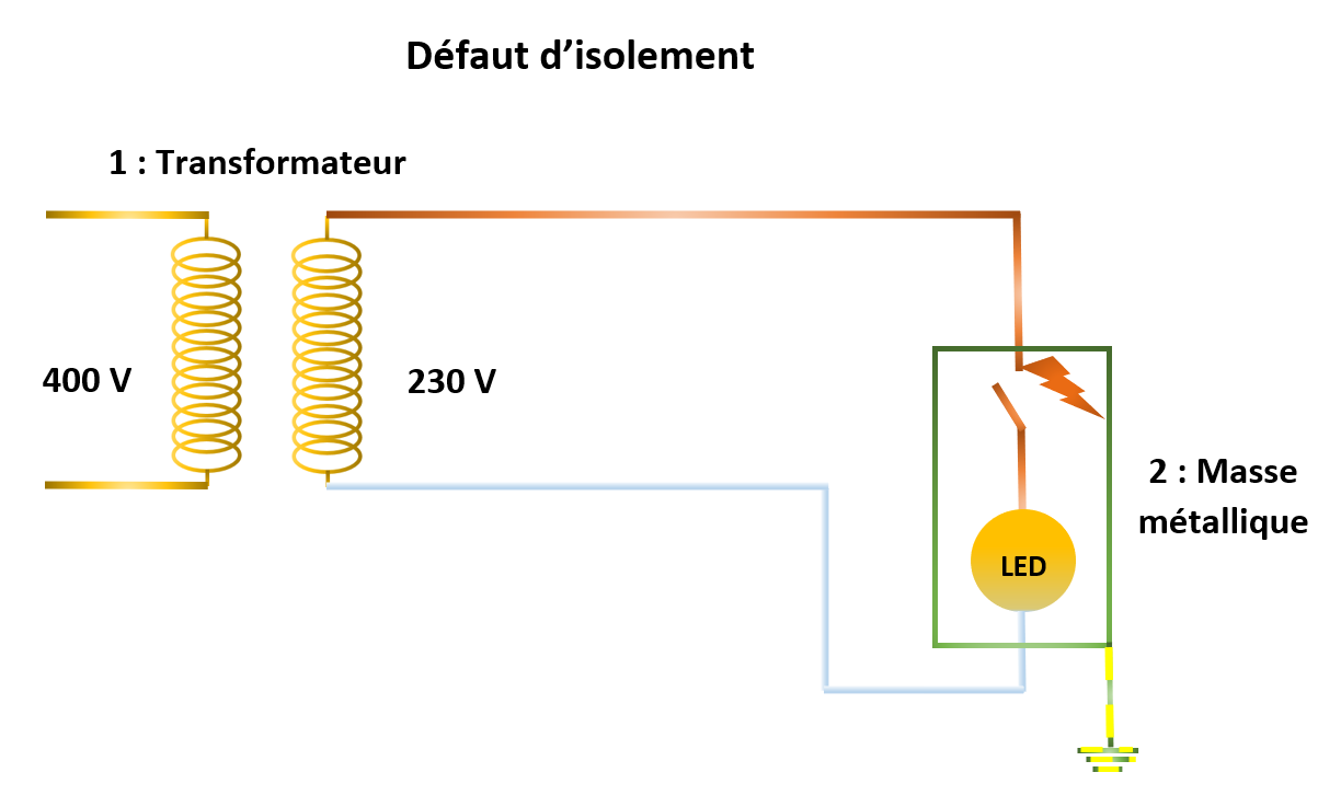 En cas de défaut d’isolement, il apparait une tension dangereuse sur les masses métalliques :
