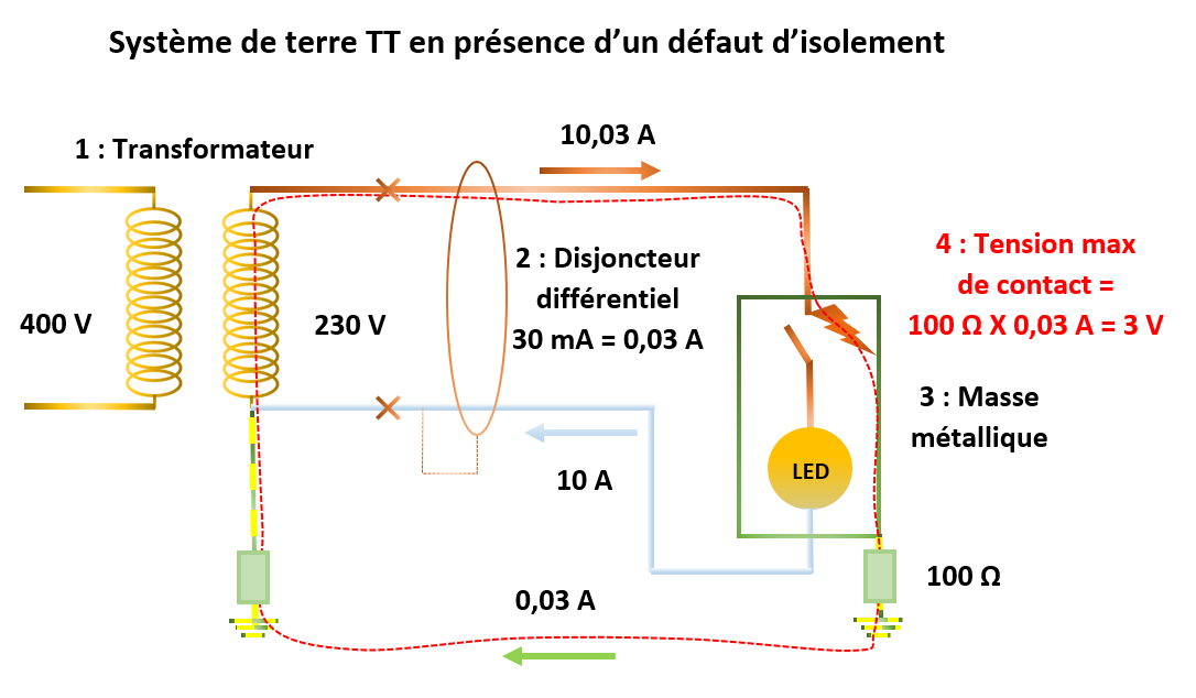 1 : Transformateur ; 2 : Disjoncteur différentiel ; 3 : Masse métallique ; 4 : Tension max de contact ;