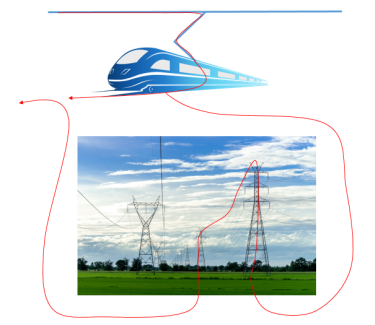 Le train est alimenté par la caténaire et le retour du courant à la source s'effectue par le rail.